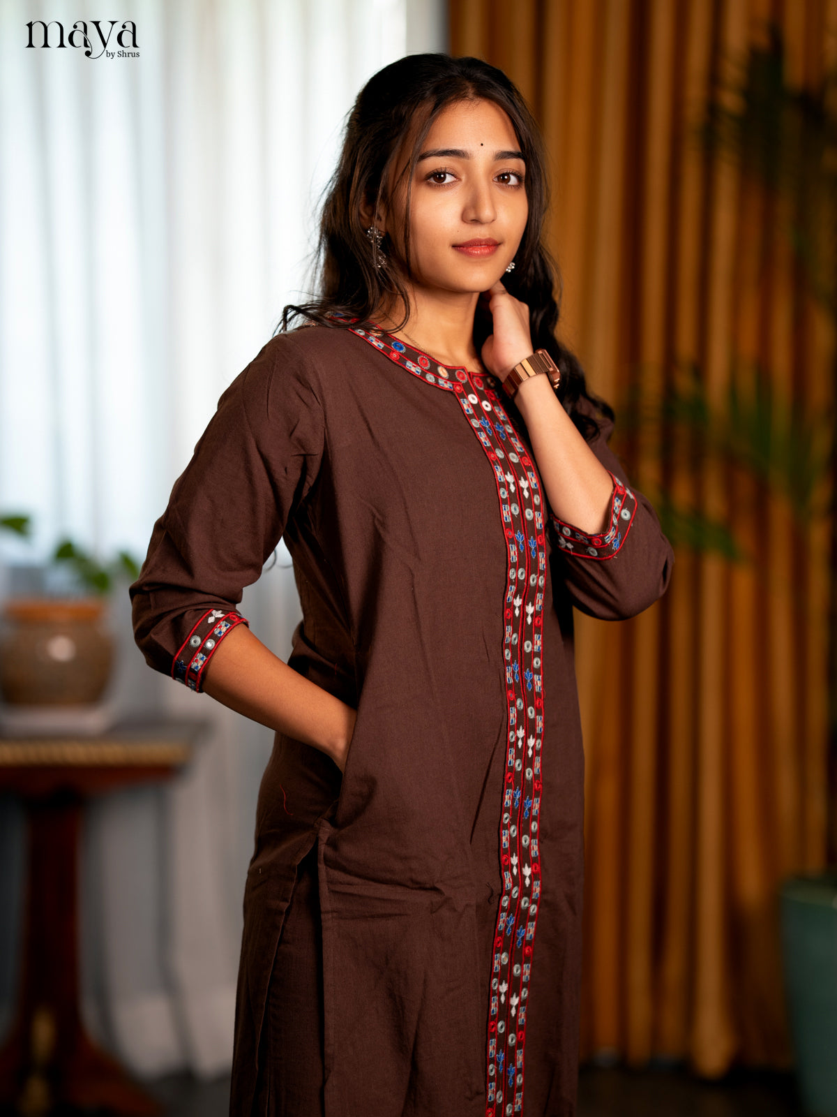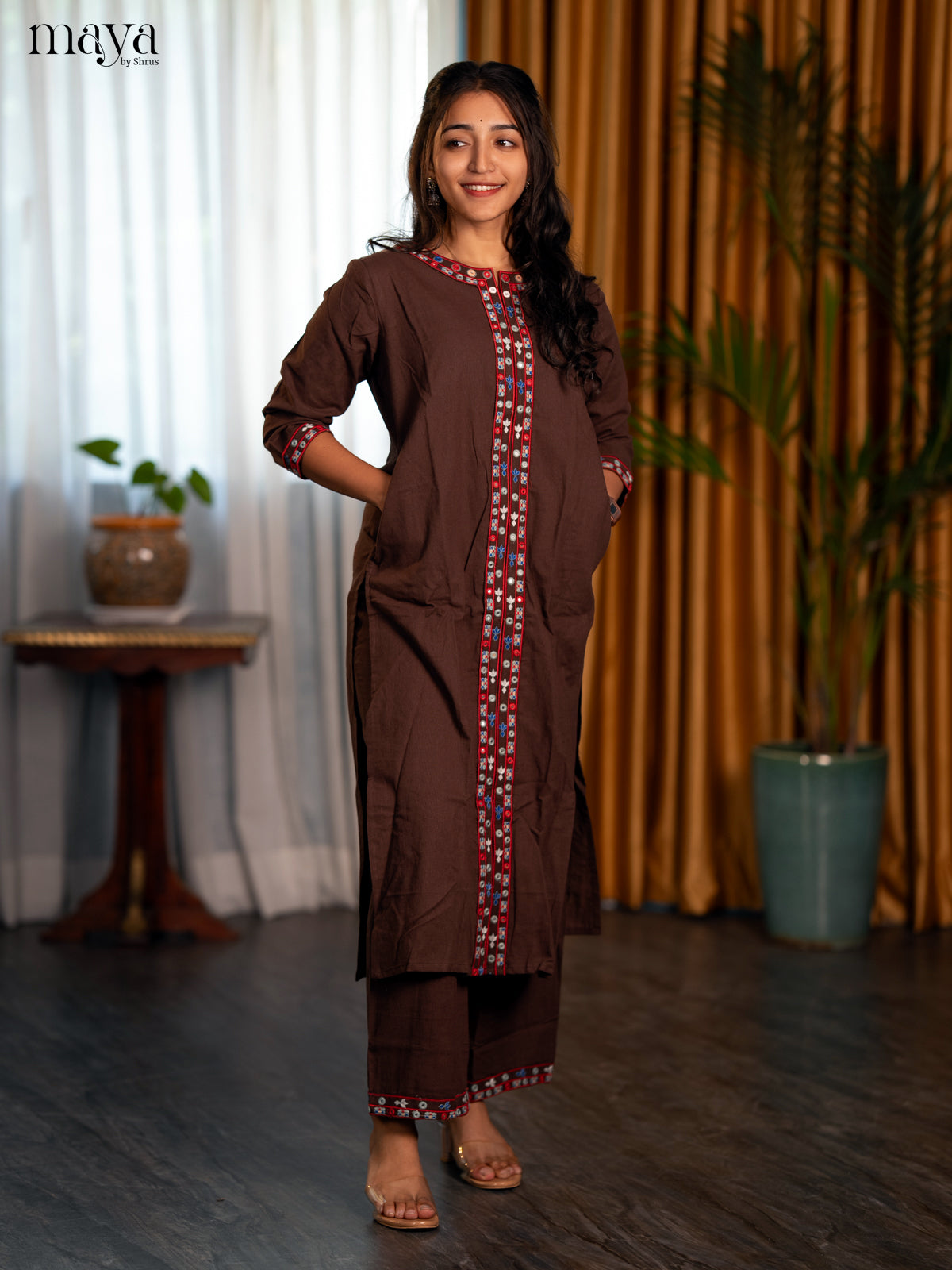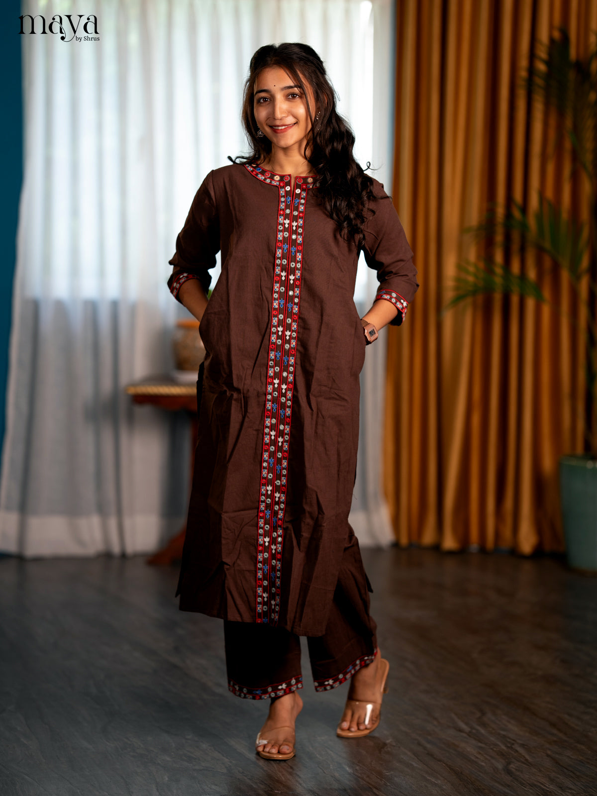 Dark Brown Cotton 2pc Embroidered Salwar Suit - Top & Bottom