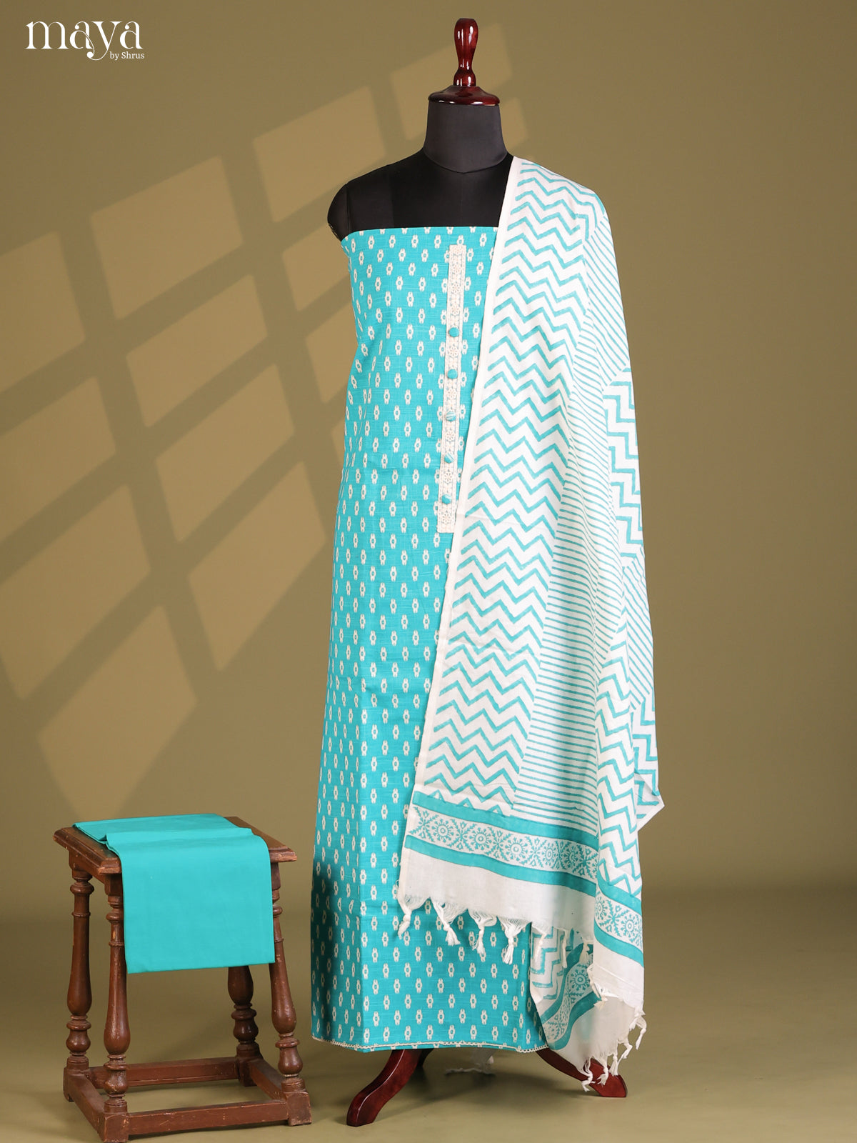 Pretty Teal Blue Cotton salwar adds a touch of beauty to any ensemble with its lovely floral print and complementary bottom and Cream dupatta. Made with high-quality cotton, this unstitched suit is perfect for any fashion-forward individual.
