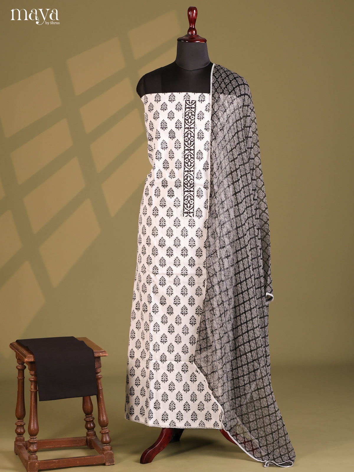 Elegant White Cotton salwar adds a touch of beauty to any ensemble with its lovely floral print and complementary Black bottom and dupatta. Made with high-quality cotton, this unstitched suit is perfect for any fashion-forward individual.