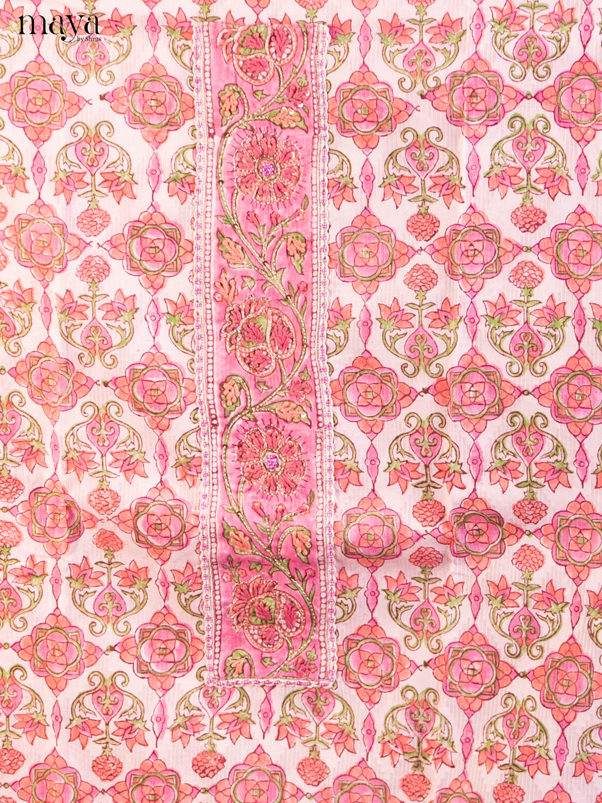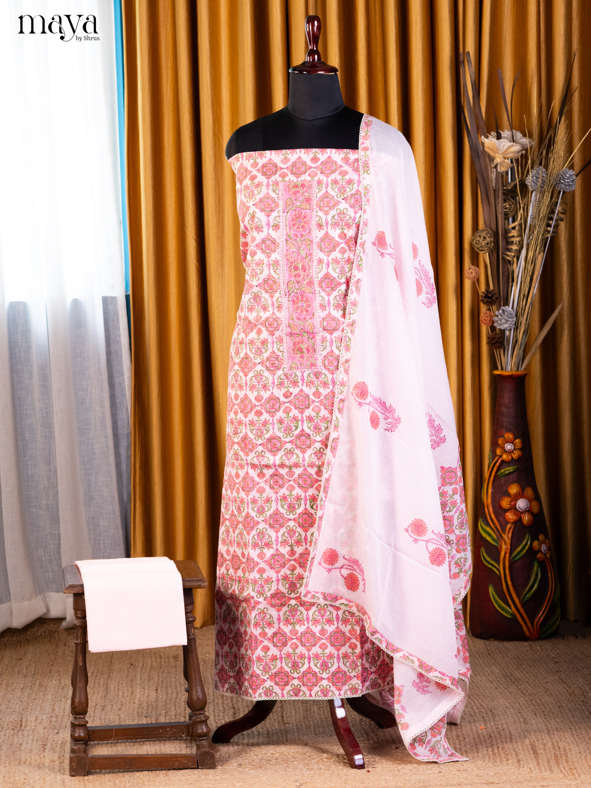 Pretty Pink & Cream Cotton salwar adds a touch of beauty to any ensemble with its lovely neck yoke ,floral print and complementary bottom and dupatta. Made with high-quality cotton, this unstitched suit is perfect for any fashion-forward individual