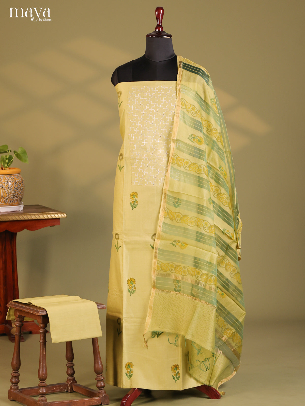 Elegant Mustardy Green Cotton salwar adds a touch of beauty to any ensemble with its lovely floral print and complementary bottom and dupatta. Made with high-quality cotton, this unstitched suit is perfect for any fashion-forward individual.