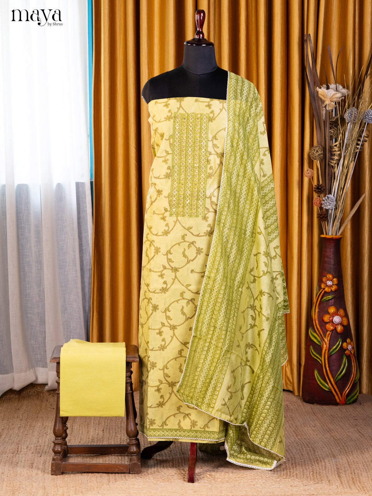 Elegant Green Cotton salwar adds a touch of beauty to any ensemble with its lovely floral print ,neck yoke and complementary self bottom and dupatta. Made with high-quality cotton, this unstitched suit is perfect for any fashion-forward individual