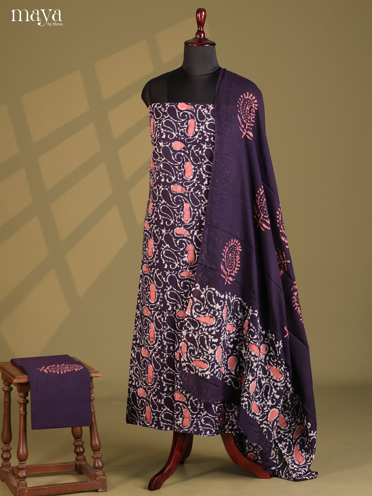 Beautiful Violet Cotton salwar adds a touch of beauty to any ensemble with its lovely Paisleys print and complementary white bottom and dupatta. Made with high-quality cotton, this unstitched suit is perfect for any fashion-forward individual.