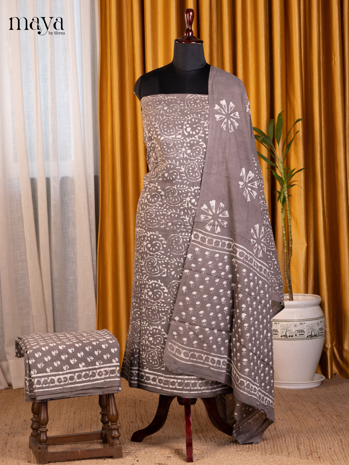 Pretty Grey Cotton salwar adds a touch of beauty to any ensemble with its lovely floral print and complementary self bottom and dupatta. Made with high-quality cotton, this unstitched suit is perfect for any fashion-forward individual