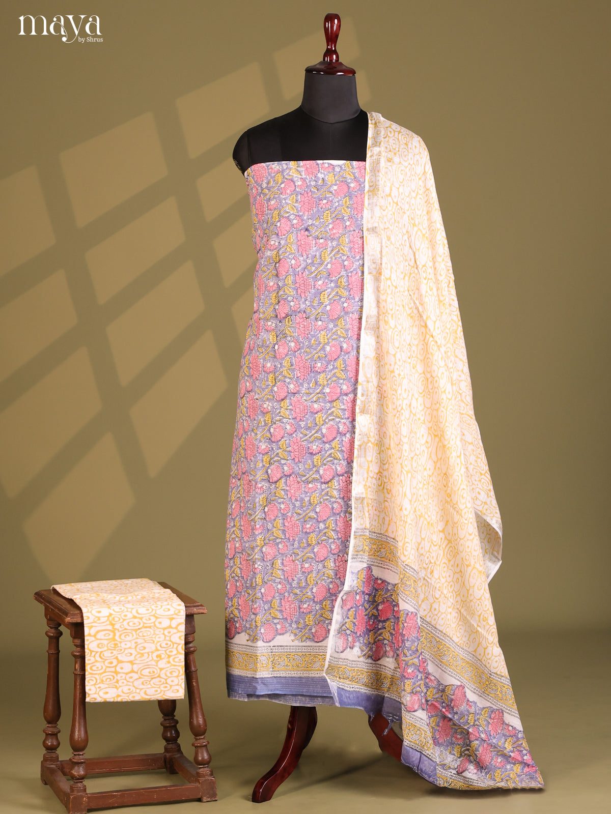 Pretty Pink Cotton salwar adds a touch of beauty to any ensemble with its lovely floral print and complementary Cream bottom and dupatta. Made with high-quality cotton, this unstitched suit is perfect for any fashion-forward individual.
