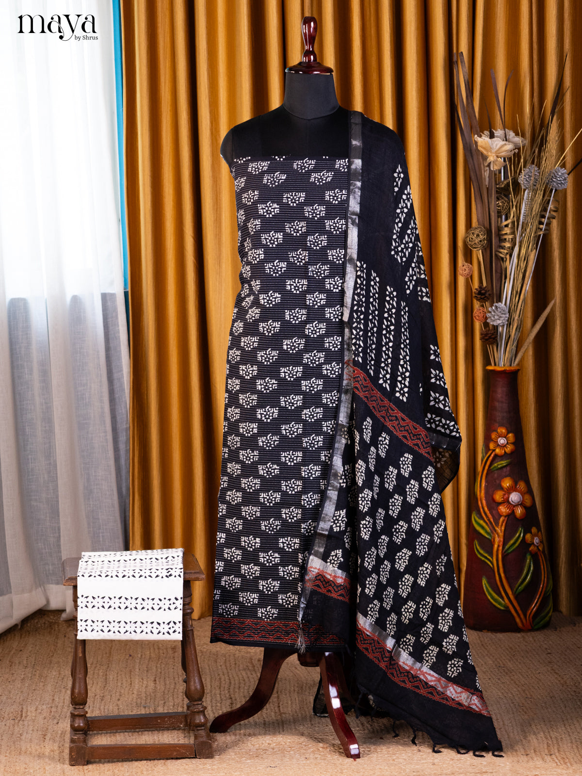 Pretty Black Cotton salwar adds a touch of beauty to any ensemble with its lovely floral print and complementary White bottom and self dupatta. Made with high-quality cotton, this unstitched suit is perfect for any fashion-forward individual