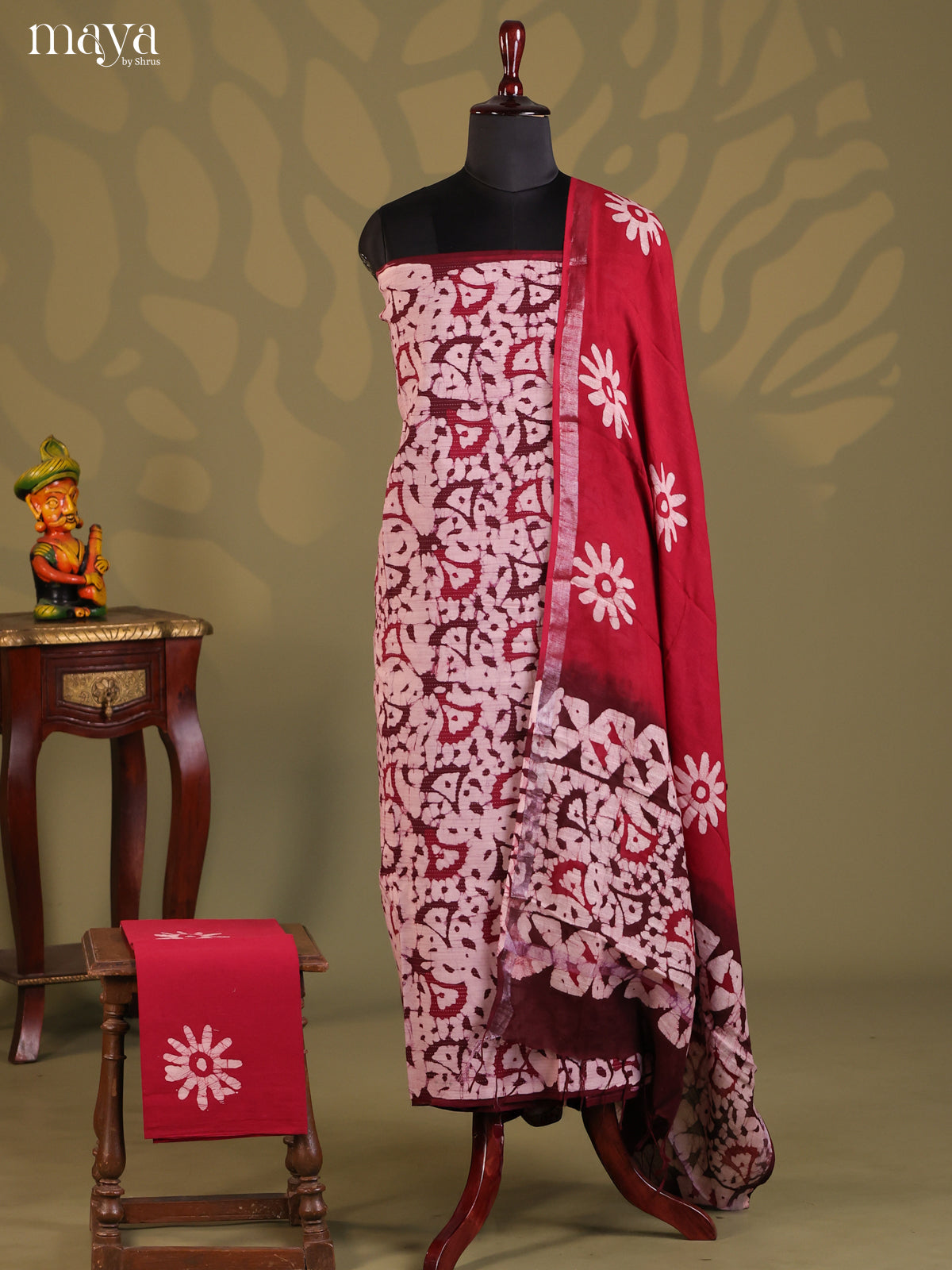 Pretty Maroon & White Cotton salwar adds a touch of beauty to any ensemble with its lovely floral print and complementary bottom and dupatta. Made with high-quality cotton, this unstitched suit is perfect for any fashion-forward individual.