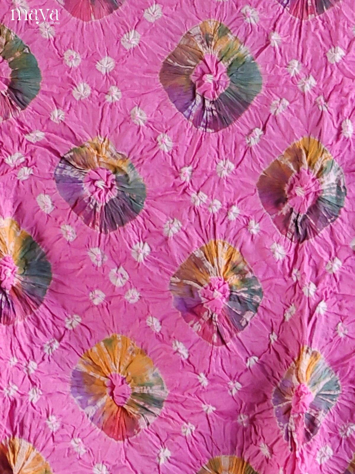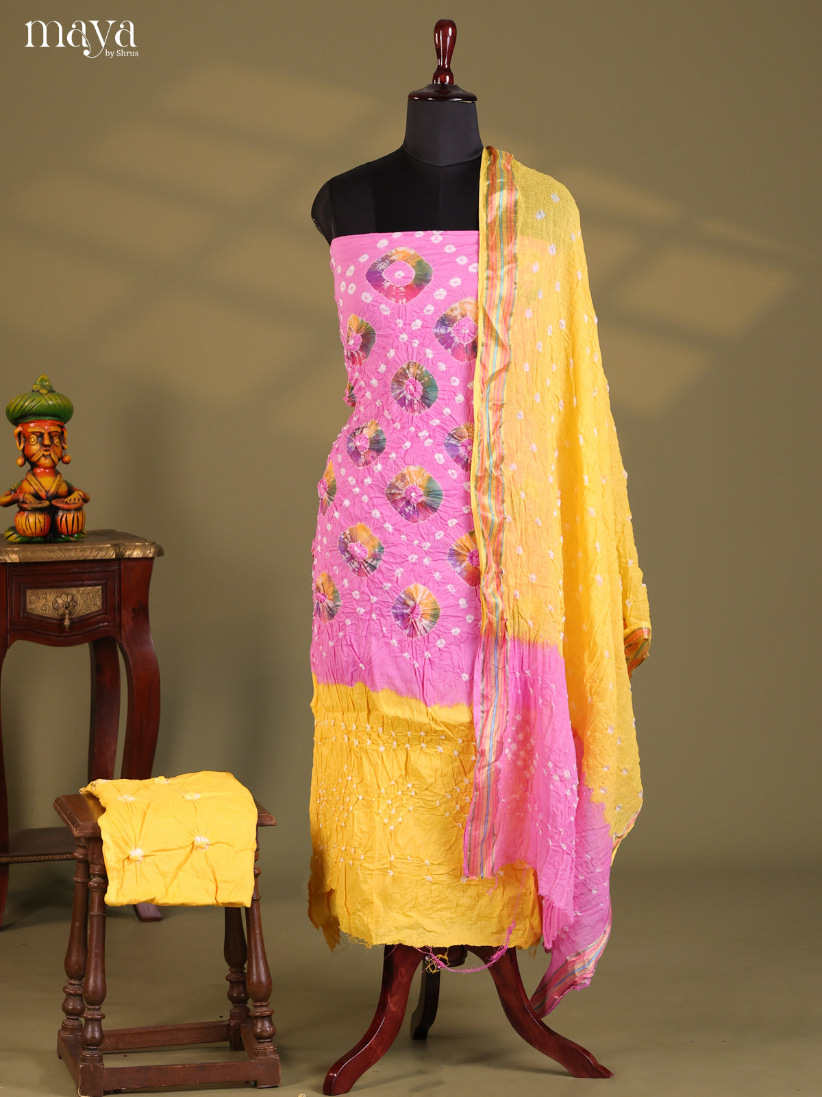 Charming Pink Bandhini Unstiched salwar is truly beautiful, featuring Bandhini pattern on the top. The suit is paired with a lovely contrast Yellow bottom and dupatta, completing the ensemble in a stylish and sophisticated manner.