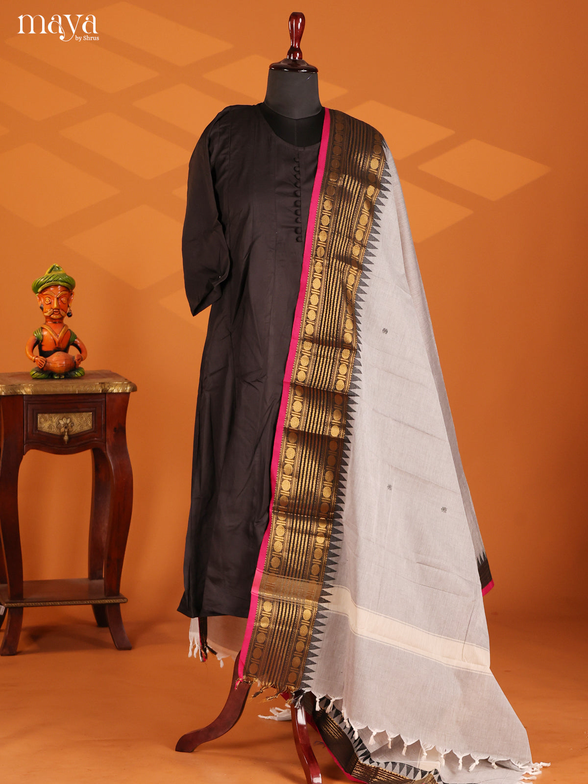 Grey Chettinad Cotton Dupatta with thread woven butta s, black zari border