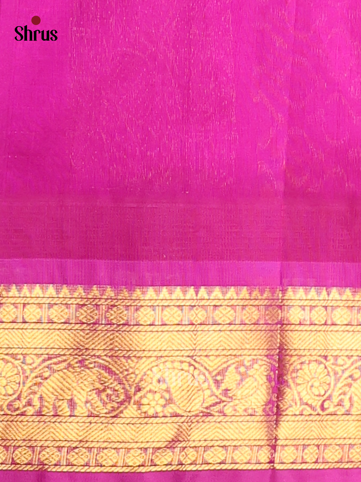 This Beautifully Chic Pista Green Cotton Silk Saree is a perfect blend of grace and charm. The body is adorned with delicate zari-woven checks and elegant buttas, adding a subtle sparkle to the soft silk cotton texture. A vibrant Majenta zari border adds a bold contrast, elevating the overall look with timeless appeal. The contrast Majenta pallu dazzles with rich zari brocade detailing, making it perfect for festive and special occasions. Paired with a matching blouse featuring a sleek zari border, this saree offers a sophisticated finish.